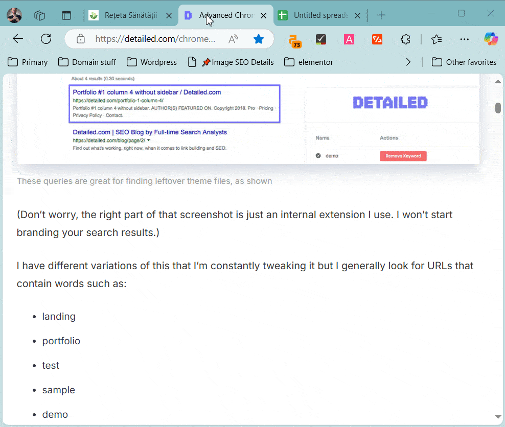 Moving on to indexing issues – with this bookmarklet you can find pages whose URLs contain words typically associated with pages not meant for indexing, such as test, sample, demo, etc.