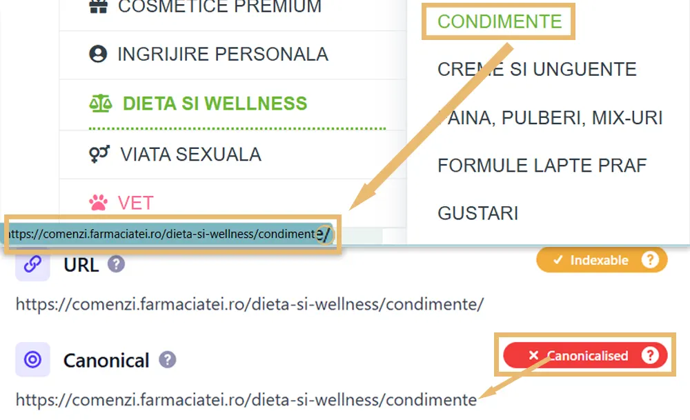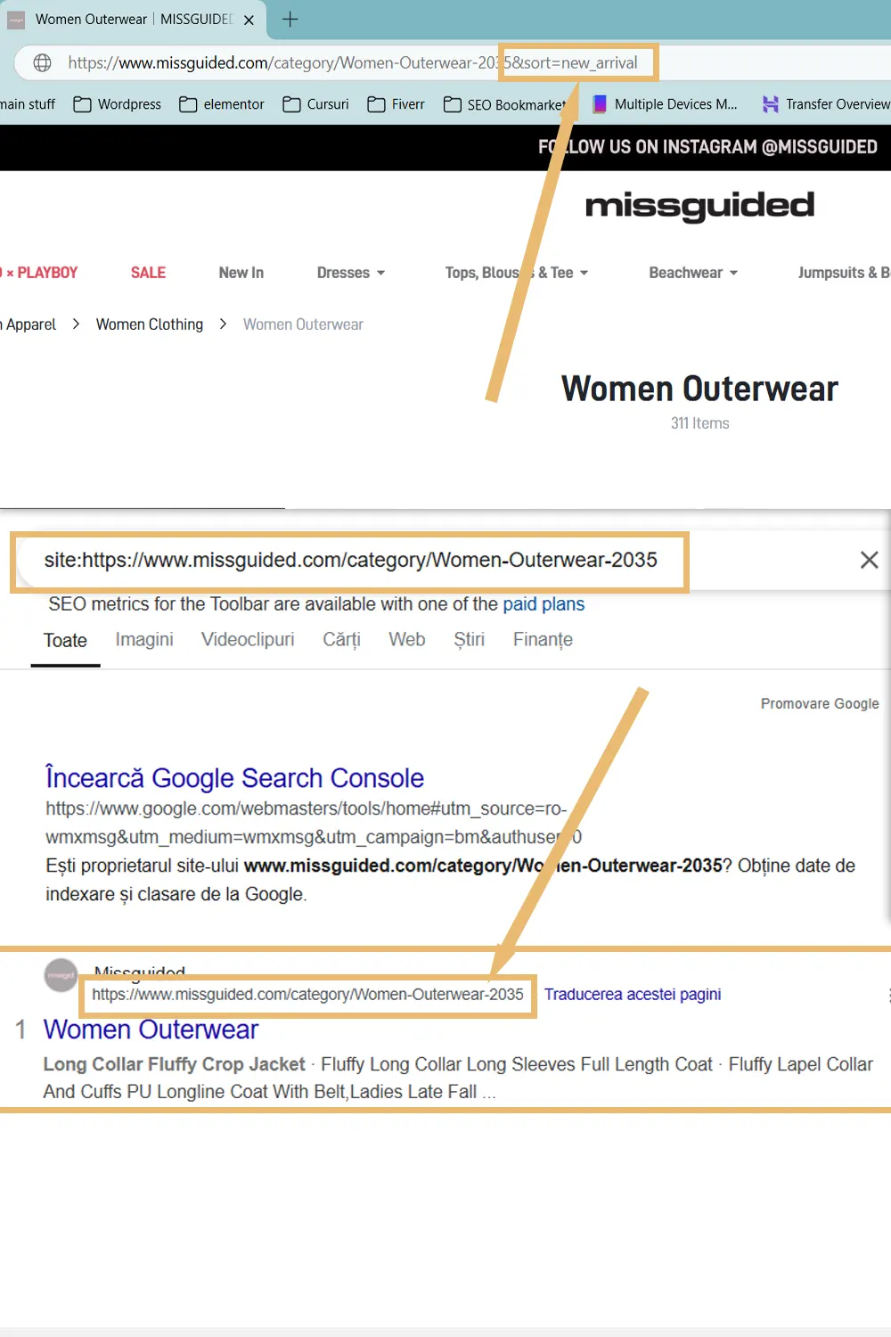 In imaginea de mai jos observam ca aceste URL-uri dinamice sunt indexabile si nu au canonical catre pagina principala de categorie – astfel Google le-a clasat ca fiind pagini individuale.