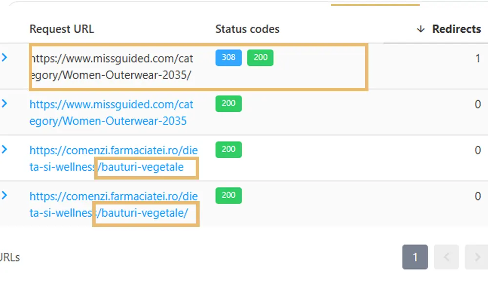 Luand ca exemplu acelasi site de mai sus vedem cum pagina cu slash face redirect catre pagina fara slash in acest caz.