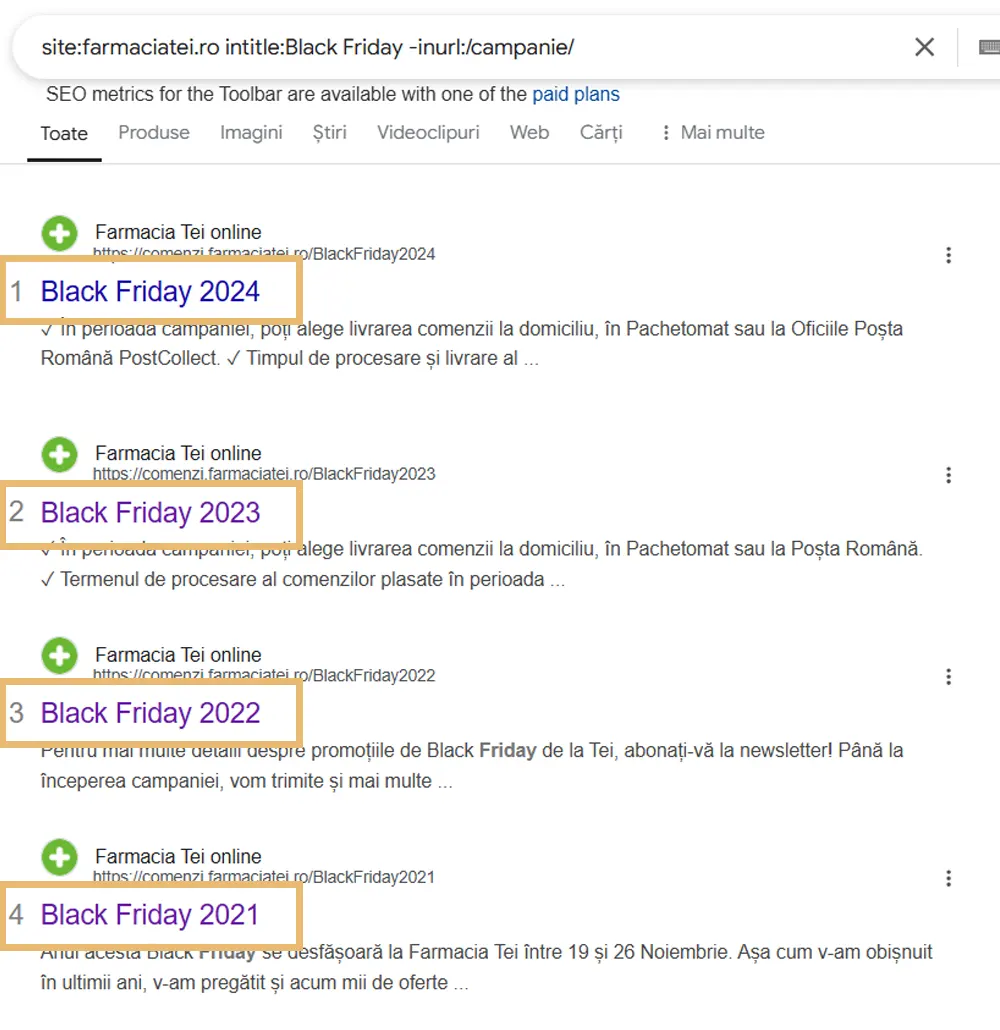 Printre problemele mai putin importante sunt aceste pagini cu Black Friday din anii precedenti inca indexate in Google.