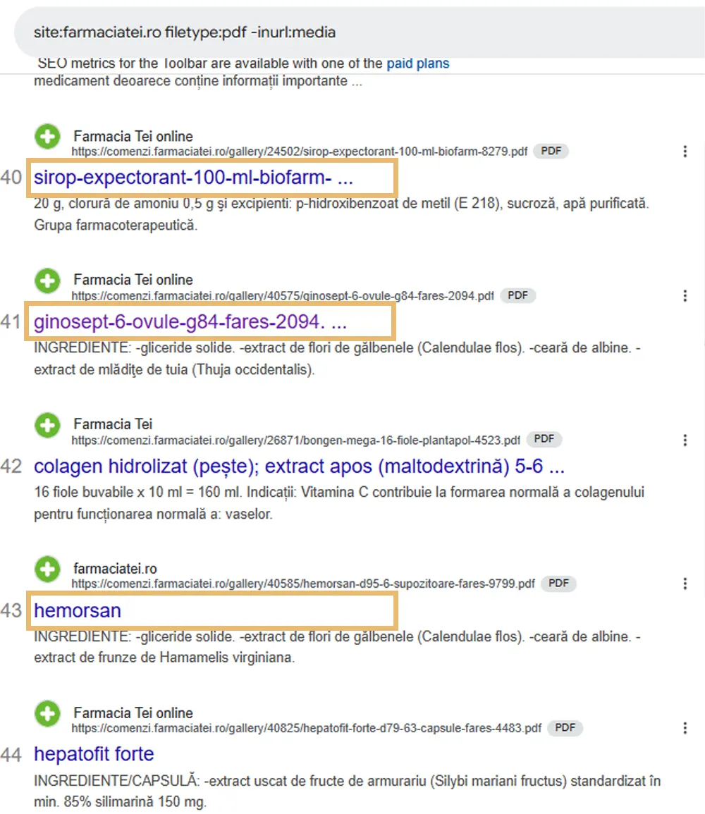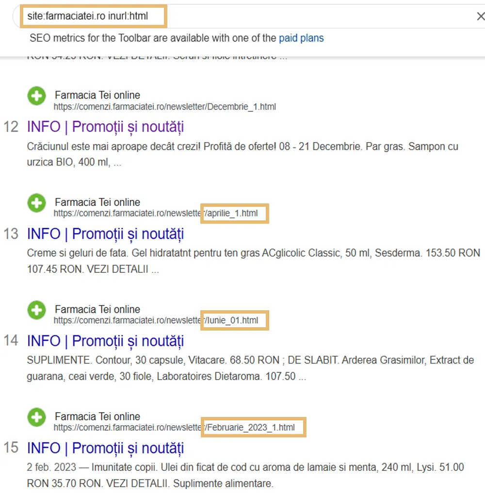 Apoi, pe farmaciatei.ro acelasi tip de pagina cu parametrul in URL &sort_by=newest este indexat in Google de mai multe ori:
