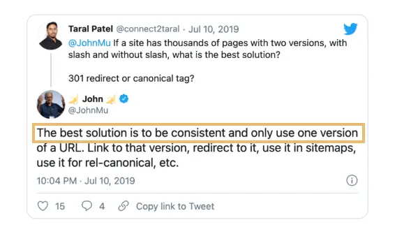 Mai jos avem un screenshot cu un tweet postat de John Muller (Google Search Advocate) in care recomanda sa fim consistenti cu o singura varianta a URL-urilor pe site.