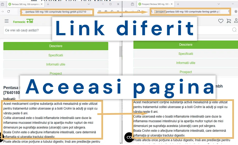 - Acelasi produs are 2 pagini identice cu URL diferite si indexabile – pagian cu produs si pagina duplicata cu ‘Prospect’ in titlul paginii.