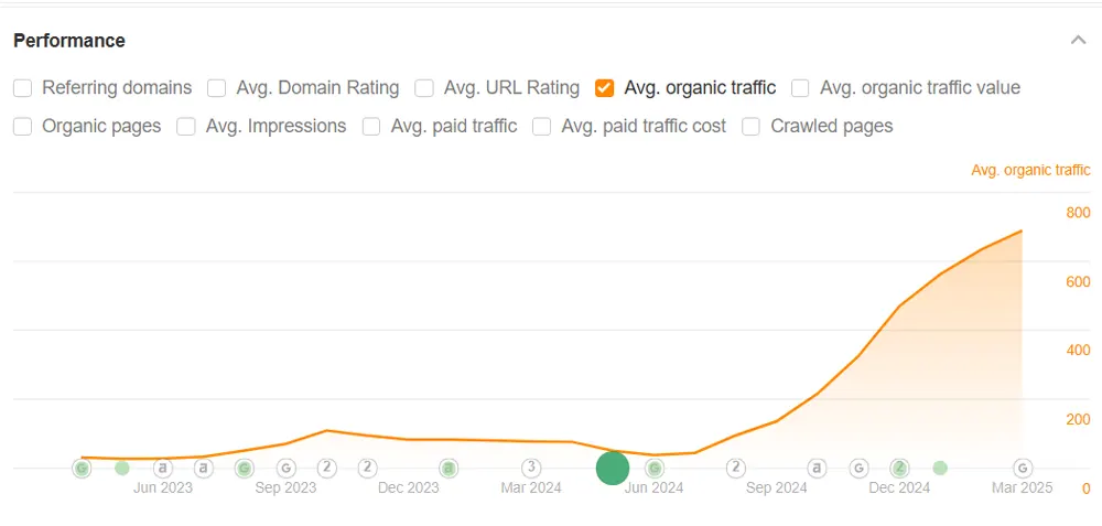 Fiind un site la care nu mai am acces in Google Search Console, m-am uitat dupa 6 luni sa vad evolutia traficului organic in ahrefs.